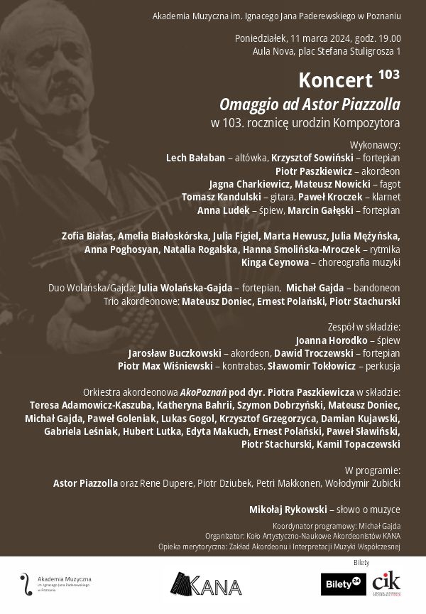 Już po raz czwarty 11 marca o godz. 19.00 świętować będziemy w Akademii Muzycznej im. I.J. Paderewskiego w Poznaniu kolejną, 103. rocznicę urodzin Mistrza argentyńskiego tanga Astora Piazzolli. Inicjatorem wydarzenia, które zapoczątkowane zostało 11 marca 2021 roku w 100. rocznicę urodzin kompozytora, jest Koło Artystyczno-Naukowe Akordeonistów. Na tegorocznym koncercie usłyszymy utwory Astora Piazzolli oraz kompozytorów XX i XXI wieku, nawiązujących do twórczości Mistrza tanga – stąd tytuł koncertu103 Omaggio ad Astor Piazzolla. Wśród wykonawców prezentować się będą instrumentalnie, wokalnie i choreograficznie studenci, absolwenci i pedagodzy poznańskiej uczelni. Obok solistów i zespołów wystąpi też Orkiestra Akordeonowa AkoPoznań.
