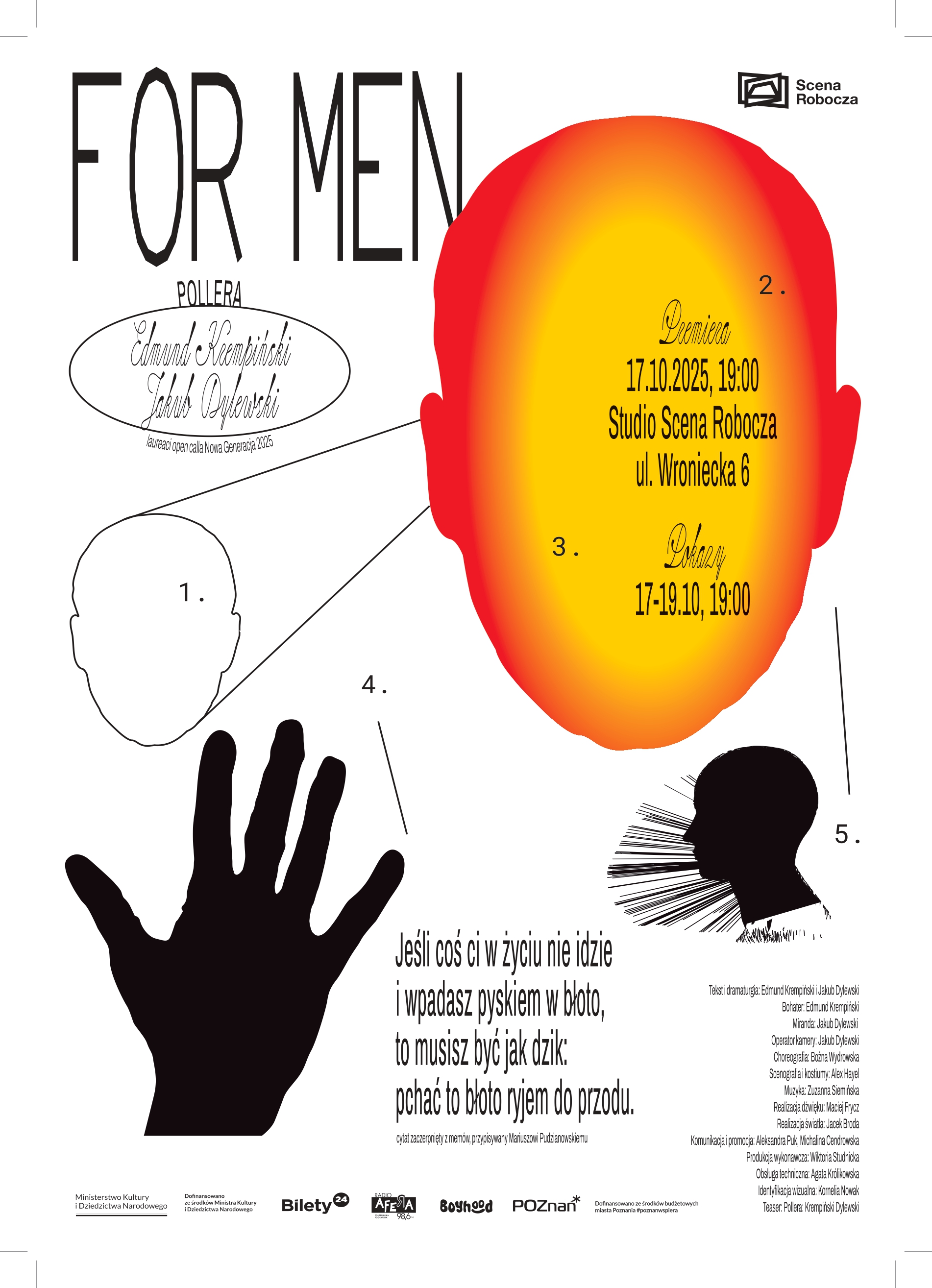 „FOR MEN” dotyka różnych odcieni kulturowej męskości – od reklamowych klisz po codzienne rytuały, od uścisku dłoni po mimikę. Spektakl odsłania mechanizmy, w których męskość staje się rolą do odegrania, zestawem gestów i reakcji, a jednocześnie polem walki z prawdą, którą niesie ciało. To opowieść o tym, jak konstruuje się wizerunek „prawdziwego faceta”, i o tym, co wymyka się spod kontroli, gdy próbuje się go utrzymać.