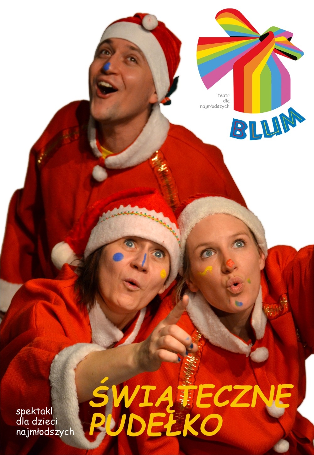 Troje aktorów w kostiumach Św.Mikołajów proponuje dzieciom wspaniałą teatralną zabawę pełną kolorów, kaształtów i dźwięków.