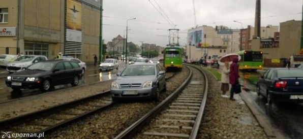 Jana Pawła II/Kórnicka: auto w torowisku. "Kierowca twierdzi, że tramwaj zajechał mu drogę"