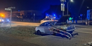Wypadek z udziałem dwóch samochodów. Jeden z pojazdów zatrzymał się na barierkach przy chodniku