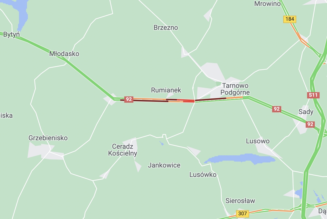Zgłoszenie o wypadku na drodze krajowej nr 92 wpłynęło do służb chwilę przed 17.00. Dyżurny wielkopolskich strażaków przyznaje, że straż pożarna jest na miejscu, ale w tej chwili nie ma informacji o szczegółach zdarzenia. - Mogę jedynie powiedzieć, że droga w miejscu zdarzenia jest zablokowana - mówi.