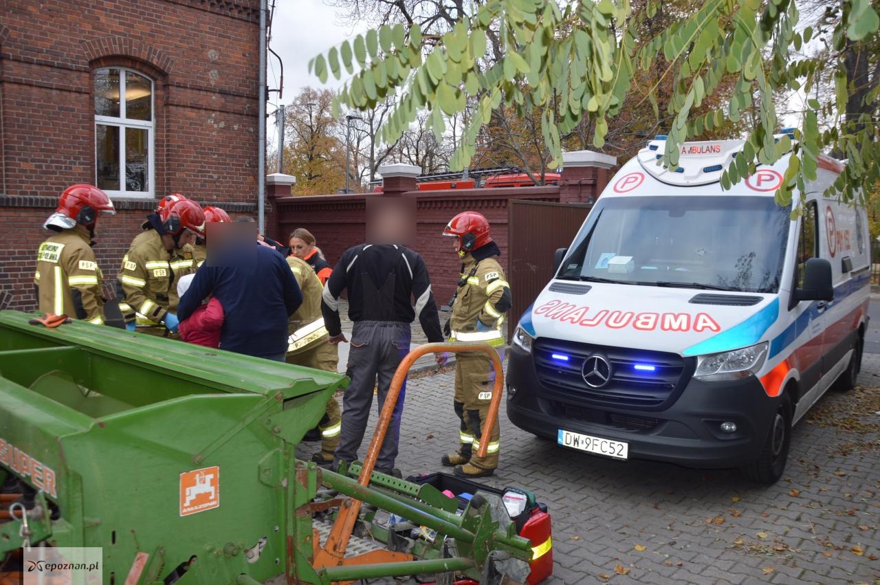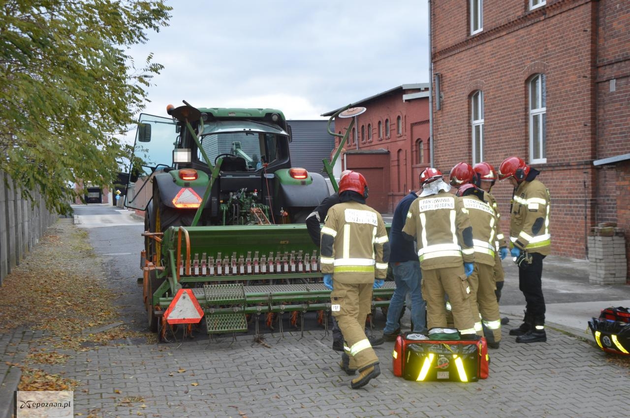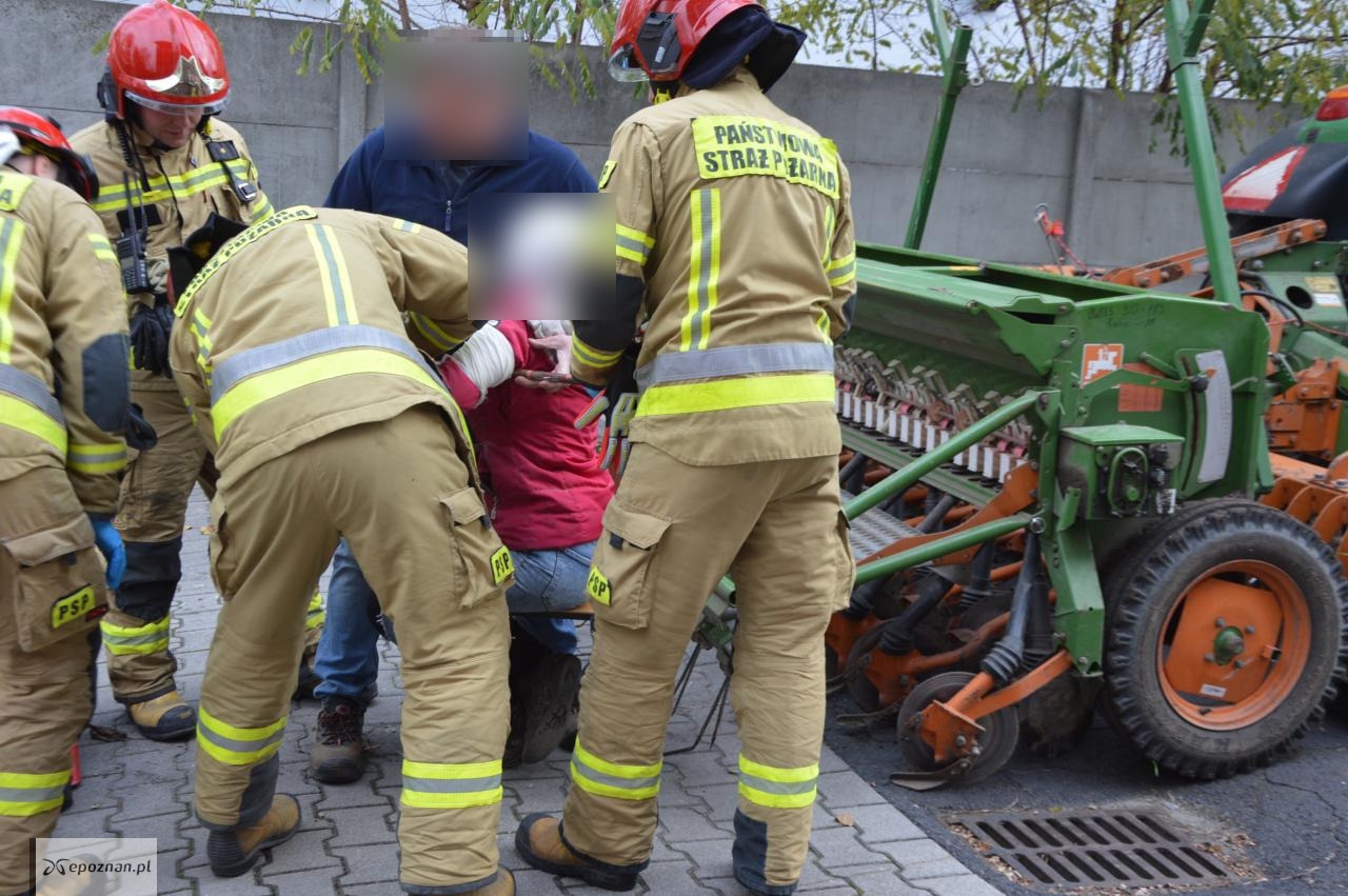 Strażacy odebrali zgłoszenie, że na terenie jednej z firm w Rawiczu znajduje się ranna kobieta. Okazało się, że właśnie tam pomocy szukał rolnik, który pracował w okolicy. Wjechał na teren przedsiębiorstwa ciągnikiem rolniczym z podczepionym siewnikiem. Na maszynie znajdowała się unieruchomiona młoda kobieta, z ręką wkręconą w jeden z podzespołów siewnika.