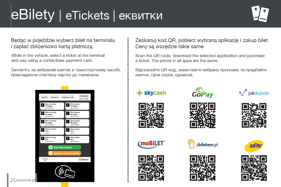 "Informacja obejmuje nie tylko aplikacje mobilne na smartfony takie jak: skycash, GoPay, jakdojade.pl, moBilet, zbiletem.pl i mPay. Pasażer może się również dowiedzieć o możliwości zakupu biletu zbliżeniowo, za pomocą karty płatniczej, w terminalu znajdującym się w pojeździe" - zapowiada Bartosz Trzebiatowski, rzecznik ZTM.