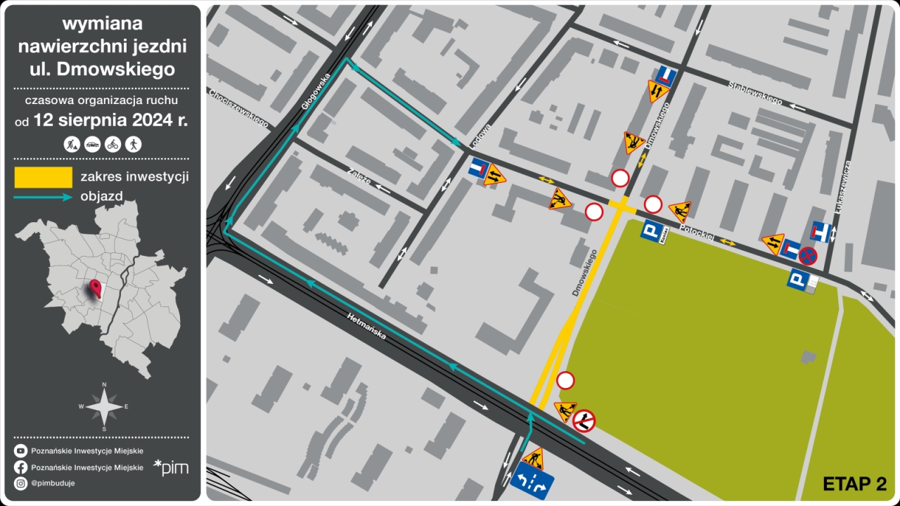- Obecnie wyłączony z ruchu jest prawy pas ul. Dmowskiego. Od 12 sierpnia prace prowadzone będą również na lewym pasie, co oznacza, że cały odcinek od ul. Hetmańskiej do ul. Potockiej nie będzie przejezdny. Podobnie wyłączone z ruchu zostanie skrzyżowanie ul. Potockiej i Dmowskiego, które także zyska nową nawierzchnię - informują Poznańskie Inwestycje Miejskie.