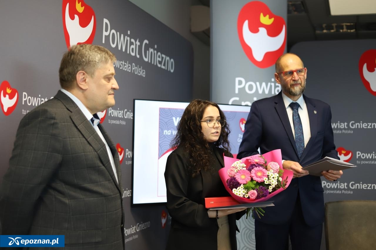 Aleksandra Arczewska - maturzystka I Liceum Ogólnokształcącego w Gnieźnie, która kilka dni temu w Poznaniu uratowała tonącego mężczyznę - odebrała podziękowania z rąk starosty gnieźnieńskiego Tomasza Budasza.