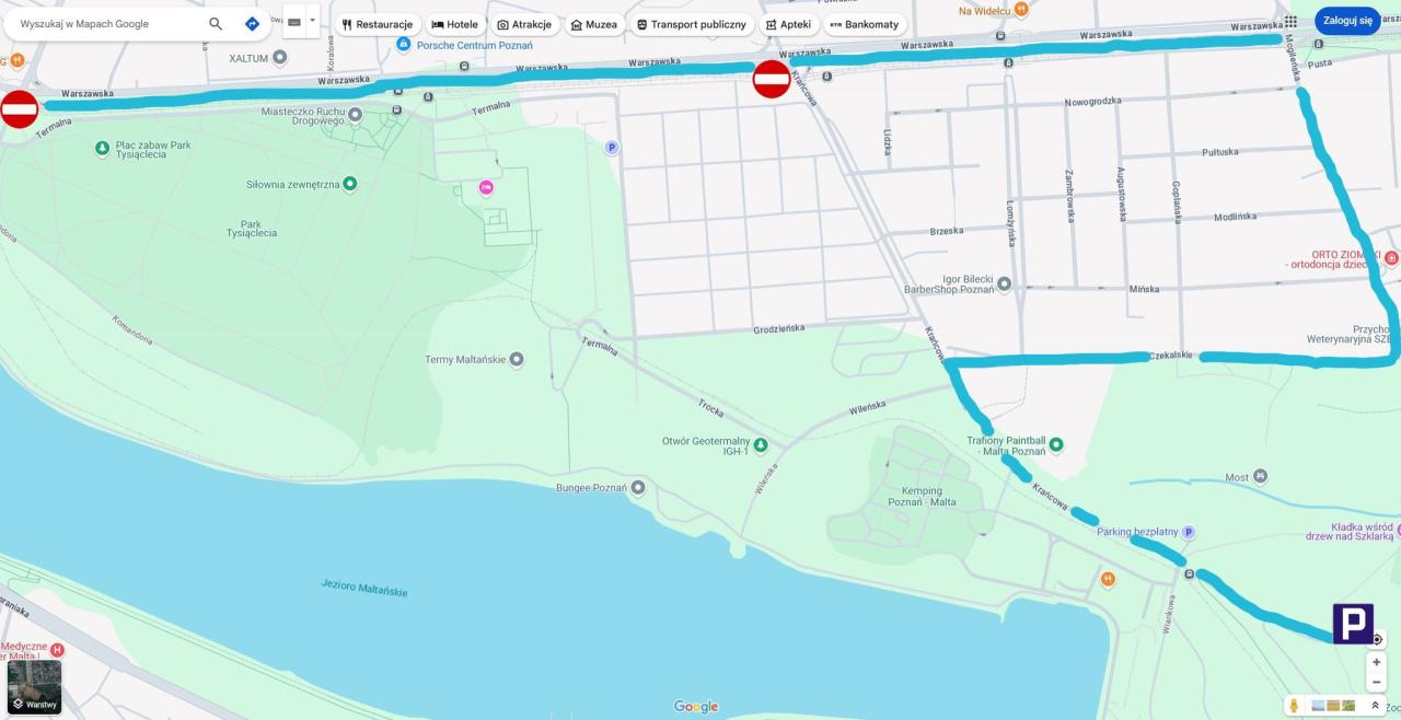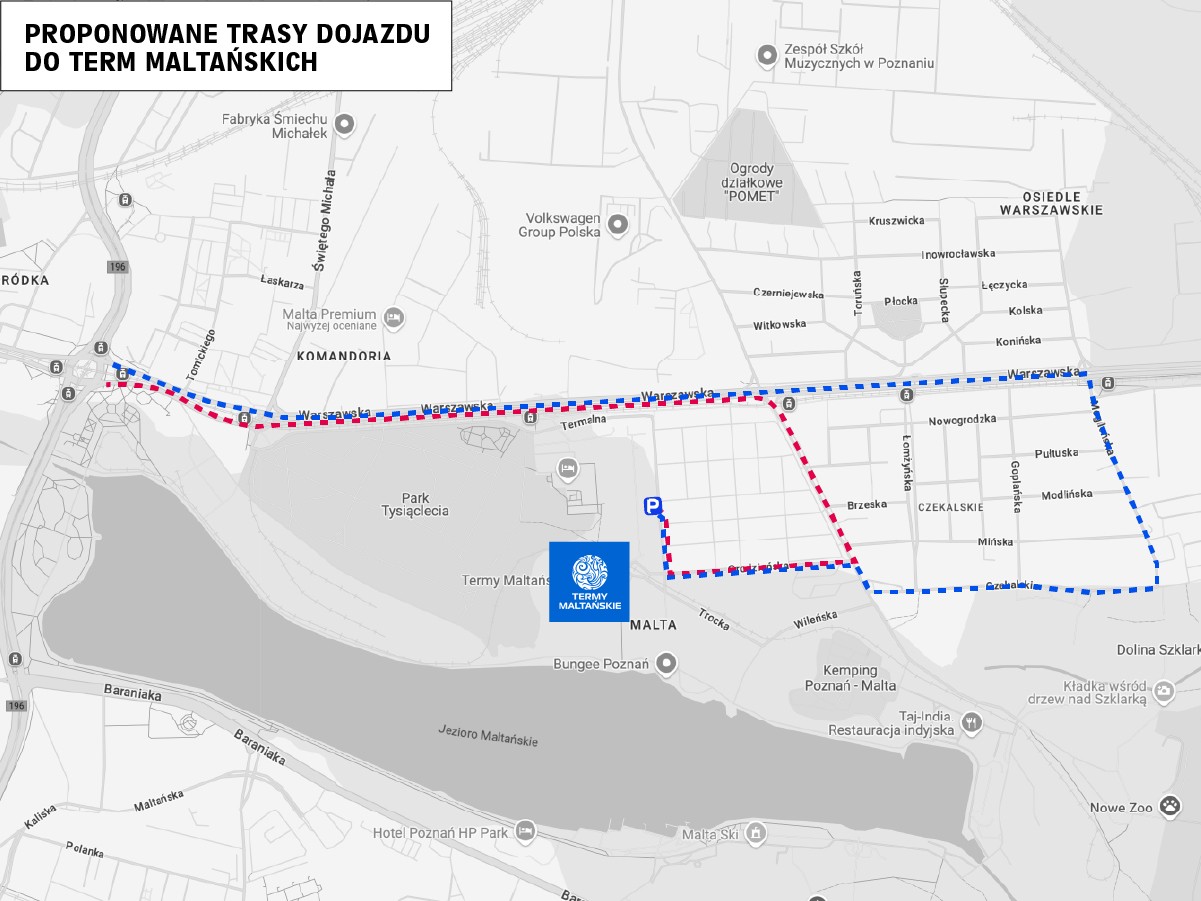 "Sposób dojazdu będzie uzależniony od zakończenia prac remontowych prowadzonych przez Zarząd Dróg Miejskich na ul. Warszawskiej. Jeśli remont ul. Warszawskiej (przy skrzyżowaniu z ul. Krańcową) zostanie zakończony: Dojazd do Term Maltańskich będzie możliwy przez: ul. Krańcową → ul. Grodzieńską → ul. Termalną (na mapie - linia czerwona). Jeśli remont nie zostanie zakończony należy kierować się przez: ul. Mogileńską → ul. Czekalskie → ul. Grodzieńską → ul. Termalną (na mapie linia niebieska)"- dodano.