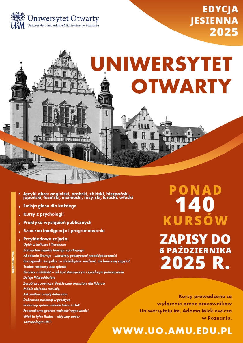 Szczegółowe opisy poszczególnych kursów, informacje o prowadzących, harmonogramach oraz warunkach rekrutacji dostępne są na oficjalnej stronie internetowej Uniwersytetu Otwartego UAM (uo.amu.edu.pl). Zapisy już się rozpoczęły, a o przyjęciu na większość zajęć decyduje kolejność zgłoszeń.