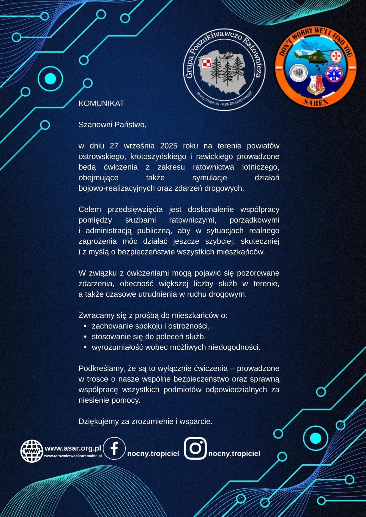 27 września 2025 roku na terenie powiatów ostrowskiego, krotoszyńskiego i rawickiego odbędą się ćwiczenia operacyjne służb ratowniczych związane z symulacją awaryjnego lądowania porwanego statku powietrznego z elementami bojowo - realizacyjnymi i zdarzeniami drogowymi.