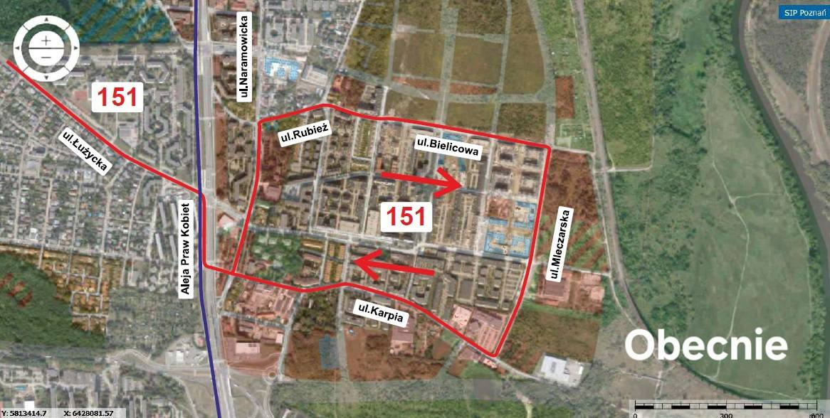 "Jednak należy pamiętać, że już sama pętla autobusowa pozwoli na zmianę trasy linii 151, jadącej obecnie "okólnie" ulicami Bielicową, Mleczarską i Karpia. Wstępnie ZTM przewiduje poprowadzenie linii 151 do nowej pętli dwukierunkowo przy ul. Karpiej, oraz uzupełnienie układu połączeń poprzez zmianę trasy linii 182, która po wydłużeniu mogłaby zostać skierowana z os. Wichrowe Wzgórze do nowej pętli poprzez Aleję Praw Kobiet i dalej ulicami Bielicową i Mleczarską, bądź też ul. Hilczer-Kurnatowskiej, przy założeniu, że powstałaby ona również do 2028 r."- dodaje.