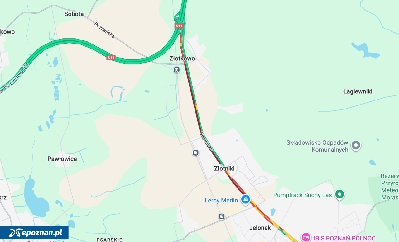 Najgorzej jest w kierunku Poznania. Kierowcy stoją od zjazdu z S11 w Złotkowie. W przeciwnym kierunku - od Suchego Lasu - także widać spowolnienie ruchu, ale korek jest tu krótszy.