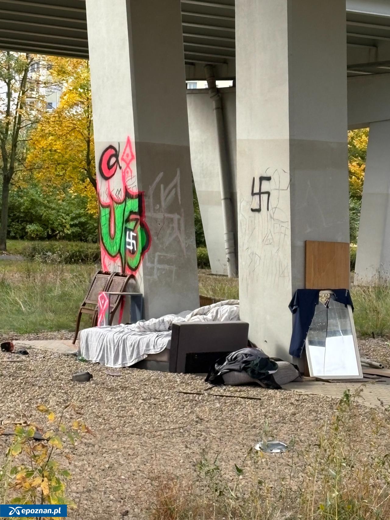 - W ubiegłym tygodniu, w środę 8.10, pod wiaduktem na Krzywoustego zamieszkało dwóch Panów, którzy to zaczepiają słownie dzieci, kobiety z psami, próbują też być agresywni dla mężczyzn. Poszedłem sprawdzić bo informacjach od syna. Faktycznie, zachowują się jak pod wpływem środków odurzających, niszczą filary wiaduktu robiąc graffiti. Ale też malują znaki SS co jest nielegalne. Sprawę zgłosiłem na numer alarmowy w sobotę - napisał Czytelnik.