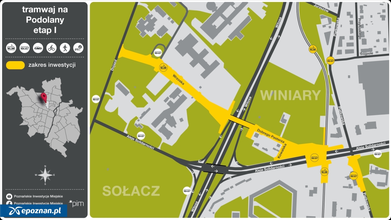 O tym projekcie piszemy na epoznan.pl od kilku miesięcy. Miasto szykuje się do budowy nowej, krótkiej trasy tramwajowej w kierunku Podolan - początkowo tramwaj miałby dojeżdżać do szpitali w rejonie Wrzoska/Juraszów. Poznańskie Inwestycje Miejskie ogłosiły przetarg na opracowanie dokumentacji projektowej na odcinku od Al. Solidarności do ul. Dojazd.