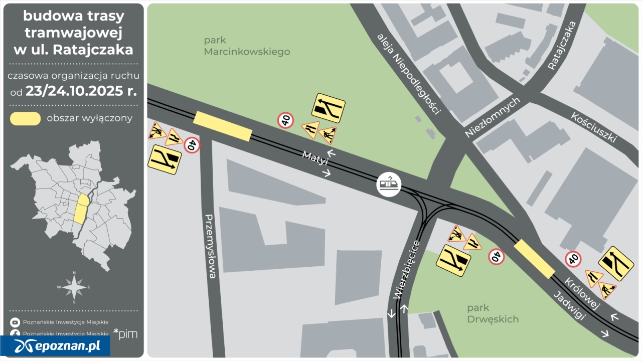 Zanim rozpoczną się zasadnicze prace budowlane, a te - jak już informowaliśmy na epoznan.pl - najpierw obejmą skrzyżowanie ulic Wierzbięcice, Królowej Jadwigi i Matyi (węzeł Wierzbięcice), trzeba przeprowadzić prace przygotowawcze. Zaplanowano je od 23 do 25 października. - Zapowiadane roboty realizowane będą w dwóch punktach - na ul. Matyi w pobliżu ul. Przemysłowej oraz na ul. Królowej Jadwigi na wysokości Novotelu. 23 października przeprowadzony zostanie demontaż krawężników przy torowisku, w trakcie tych prac zajmowane będą wewnętrzne pasy jezdni ulic Matyi i Królowej Jadwigi we wskazanych miejscach. W następnych dniach, do 25 października włącznie, pasy zajmowane będą tylko w razie konieczności (np. ruchu ciężkiego sprzętu), w pozostałym czasie na jezdni będą wygrodzenia ostrzegawcze w miejscu krawężników - informują Poznańskie Inwestycje Miejskie. - Prace realizowane będą głównie w torowisku, dlatego zaplanowano je na noce z 23 na 24 i 24 na 25 października, by możliwe było jeszcze utrzymanie ruchu tramwajowego. Podczas prac prędkość zostanie ograniczona do 40 km/h - dodają.