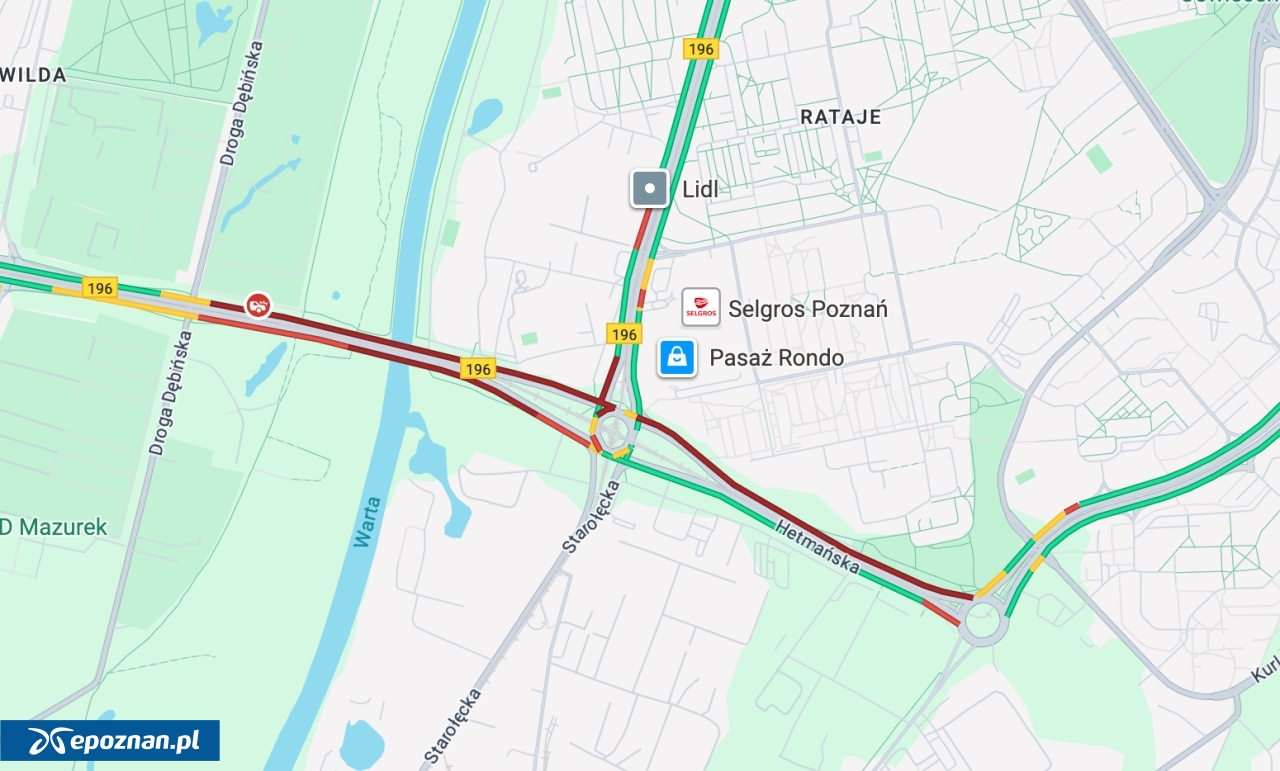 Jak mówi nam pracownik centrali Nadzoru Ruchu MPK, auto wjechało na torowisko w rejonie przystanku Hetmańska Wiadukt nad Drogą Dębińską. - W tej chwili nie jedziemy tramwajami od ronda Starołęka w kierunku 28 Czerwca 1956 roku. Tramwaje jadą objazdem przez Królowej Jadwigi - tłumaczy.