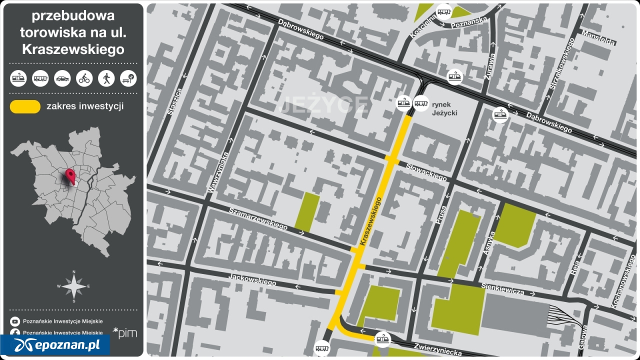 Poznańskie Inwestycje Miejskie ogłosiły przetarg na opracowanie dokumentacji projektowej dla rozbudowy torowiska tramwajowego w ciągu ulicy Kraszewskiego wraz z infrastrukturą. Miasto chce przebudować całe torowisko na ulicy - od Rynku Jeżyckiego do Zwierzynieckiej.