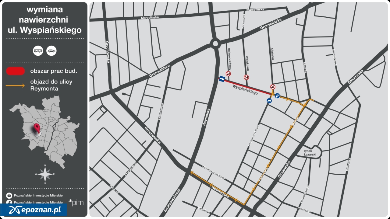 Jak już informowaliśmy w weekend, wciąż trwają prace związane z wymianą nawierzchni ul. Wyspiańskiego na odcinku od ul. Reymonta do ul. Jarochowskiego. Wcześniej zapowiadano, że w trwającym tygodniu wykonawca przystąpi do regulacji krat wpustów deszczowych oraz wymiany studni. "Z tego planowana jest zmiana organizacji ruchu polegająca na wyłączeniu jezdni południowej ul. Wyspiańskiego i otwarciu jezdni północnej. Tym samym w dalszym ciągu ruch odbywać będzie się jednokierunkowo"- zapowiadali przedstawiciele PIM. Zapowiadano wówczas, że wprowadzenie zmiany planowane jest na przełom 27 i 28 października, przy czym realizacja zaplanowanych robót uzależniona jest warunków atmosferycznych. Zaszły zmiany.