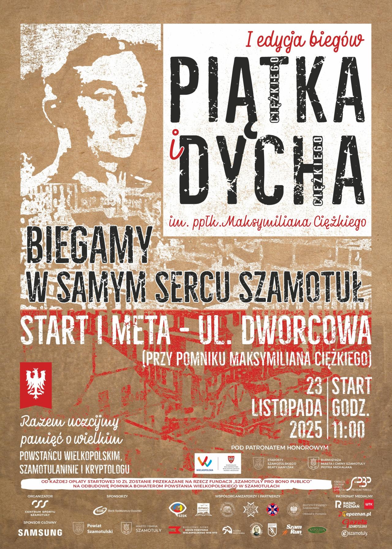 Centrum Sportu w Szamotułach zaprasza wszystkich miłośników biegania na wyjątkowe wydarzenie. Już 23 listopada wystartuje "Piątka i Dycha Ciężkiego". To nie tylko bieg, ale również ciekawa lekcja historii o lokalnych bohaterach Powstania Wielkopolskiego.