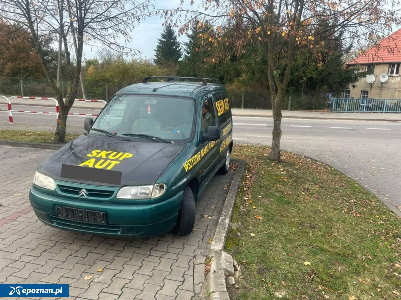 Samochód z napisem "Skup aut" stoi na parkingu pod marketem i blokuje miejsce. Pojazd nie ma tablic rejestracyjnych