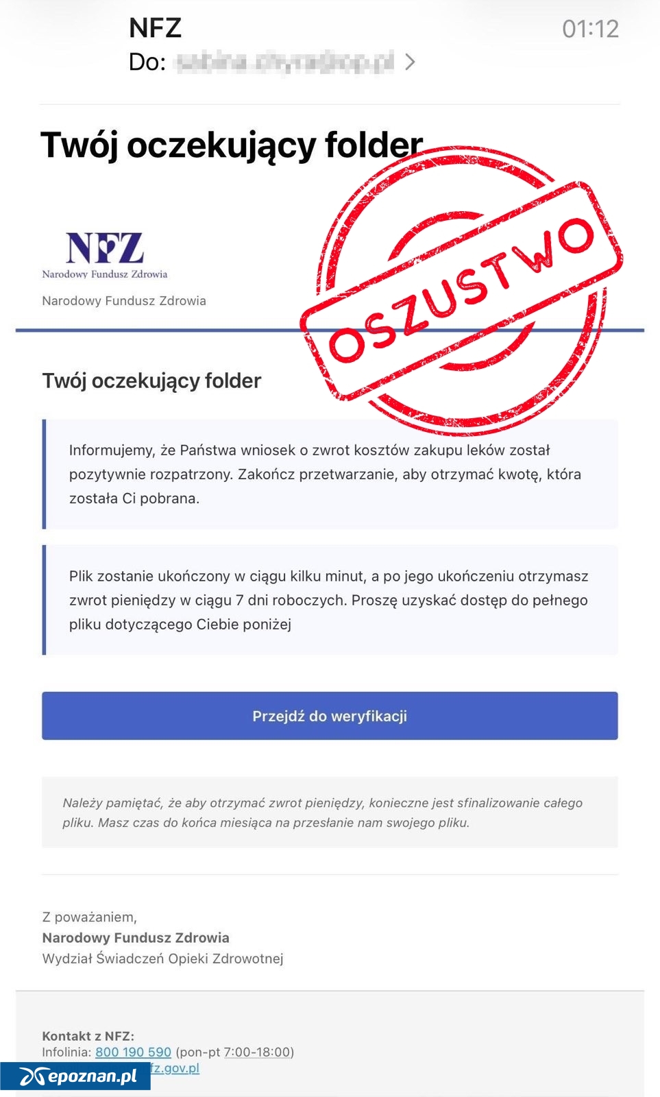 Narodowy Fundusz Zdrowia przestrzega przed kolejnym oszustwem. - Oszuści wysyłają profesjonalnie wyglądające e-maile, których nadawcą jest rzekomo Narodowy Fundusz Zdrowia. W wiadomościach opatrzonych logo Funduszu informują o "zwrocie kosztów leków" - tłumaczą. - Wiadomość zawiera link pod widocznym przyciskiem "Przejdź do weryfikacji". To pułapka! W ten sposób cyberprzestępcy chcą pozyskać dane nieświadomych zagrożenia użytkowników - dodaje.