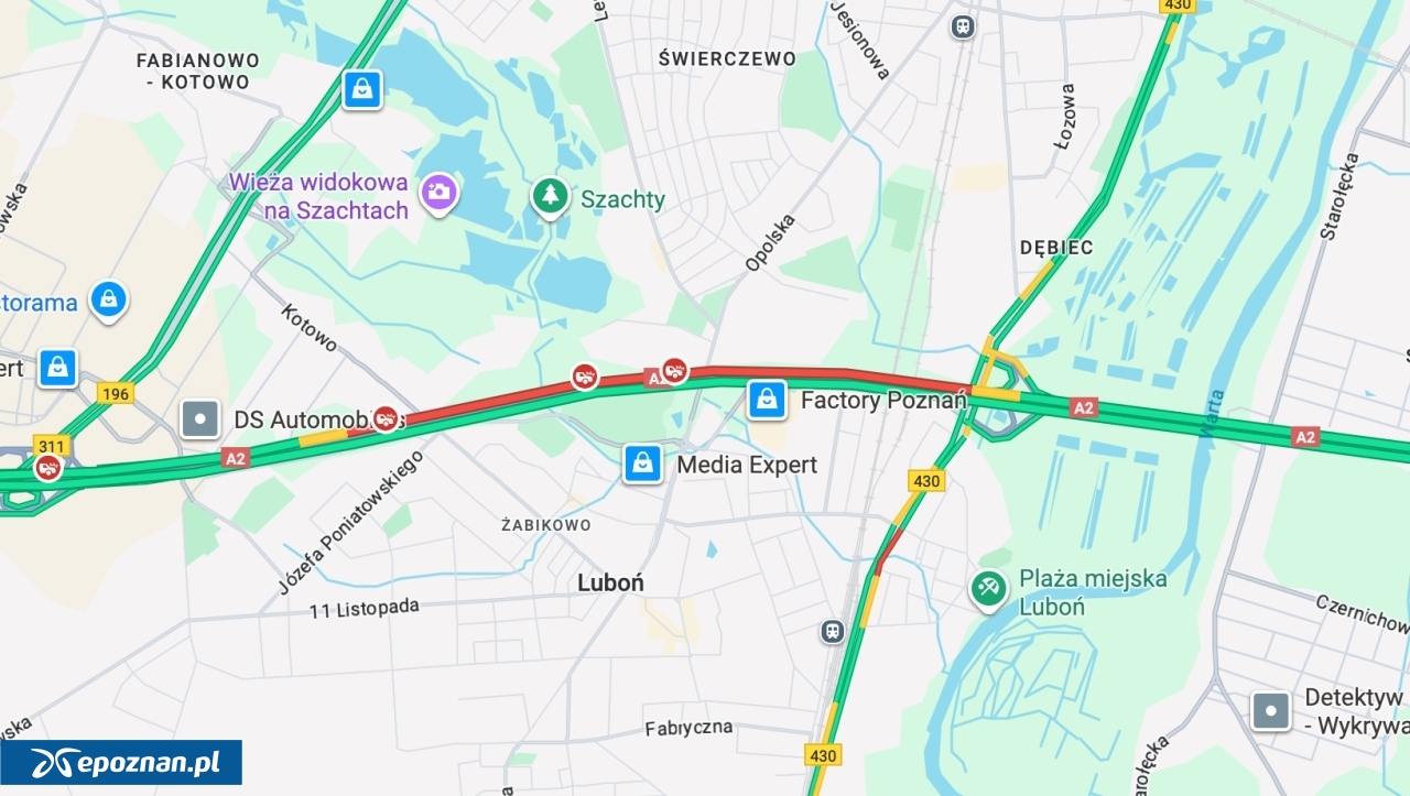 Kierowcy jadący w kierunku Świecka muszą się liczyć z utrudnieniami między węzłami Luboń i Komorniki.