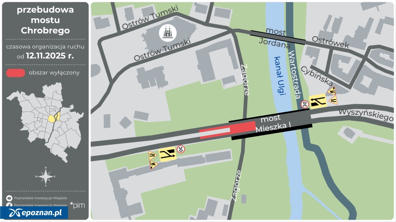 Docelowo, na czas przebudowy mostu Chrobrego, kierowcy będą poruszać się w dwóch kierunkach tylko jedną nitką mostu. Po to budowane są przewiązki na ulicach Estkowskiego i Wyszyńskiego. - Jadący od ronda Śródka w stronę centrum przejadą na jezdnię południową przewiązką tuż za mostem Mieszka I, a wrócą na północną stronę na ul. Estkowskiego. Zmiana polegająca na przełożeniu całego ruchu na nitkę południową, z wykorzystaniem wspomnianych przewiązek, planowana jest na grudzień. O terminie będziemy informować. Po rozbiórce i budowie na nowo części północnej to ona przejmie cały ruch w obu kierunkach, a wykonawca analogicznie przystąpi do rozbiórki i budowy na nowo części południowej.