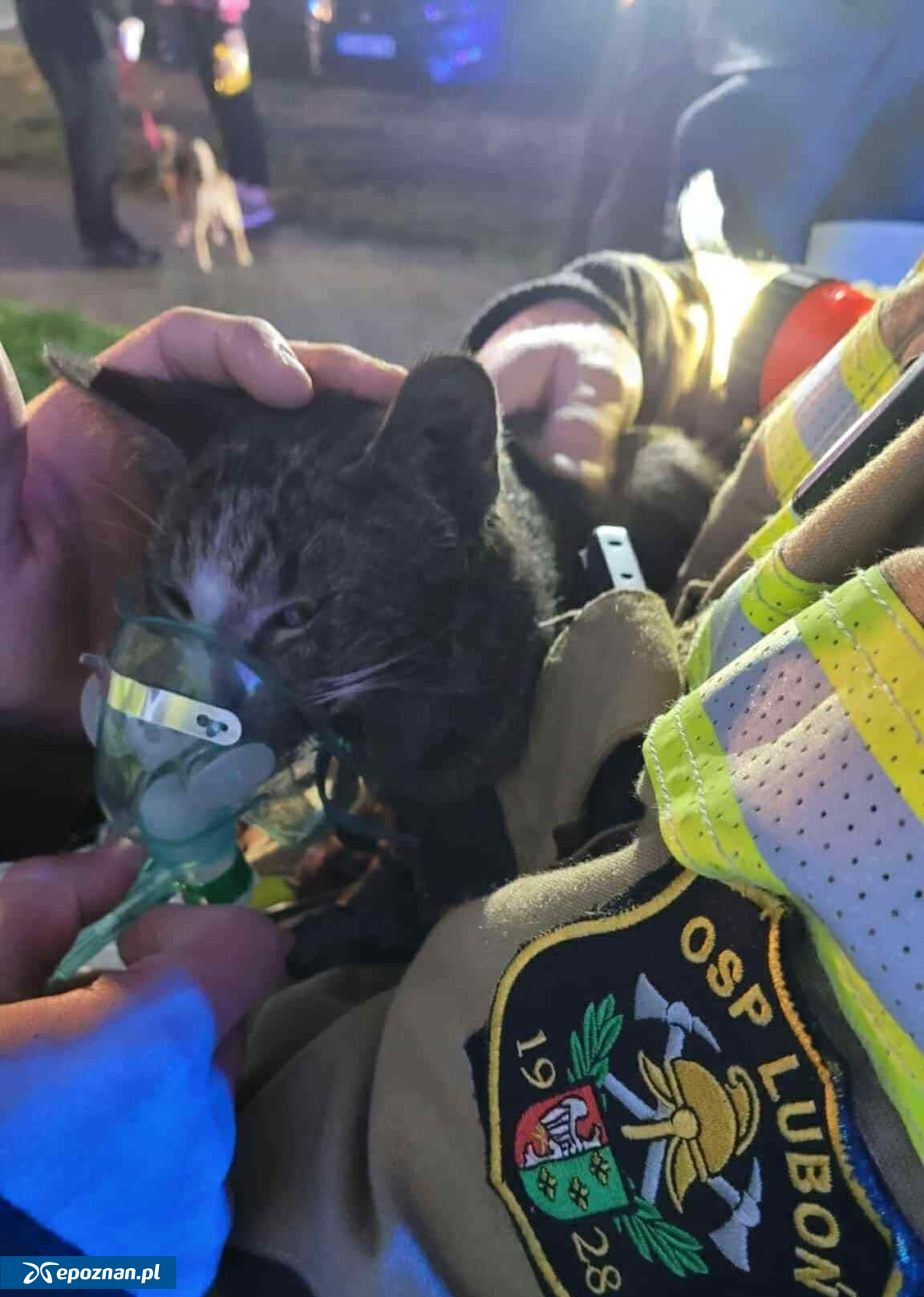 Okazuje się, że w pożarze ucierpiał kot. Strażacy z OSP Luboń poinformowali w środę, że udało im się uratować poparzonego kotka.