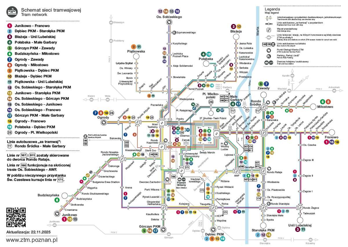"Od 22 listopada (sobota) zostaną wprowadzone zmiany w komunikacji tramwajowej. Dwie linie - numer 4 i 17 zostaną skierowane do przystanku Małe Garbary. "Siedemnastka" będzie miała zmienioną trasę, tramwaj z ulicy Gwarnej nie będzie już kursował w kierunku Mostu Teatralnego i na Winogrady, lecz pojedzie na Małe Garbary. Natomiast z pętli Połabska na Winogradach do Małych Garbar będzie kursować "czwórka". Zmieniona zostanie także trasa linii numer 28, która z Ogrodów zamiast na Al. Marcinkowskiego będzie kończyć (i zaczynać) swoją trasę na placu Wielkopolskim"- dodaje.