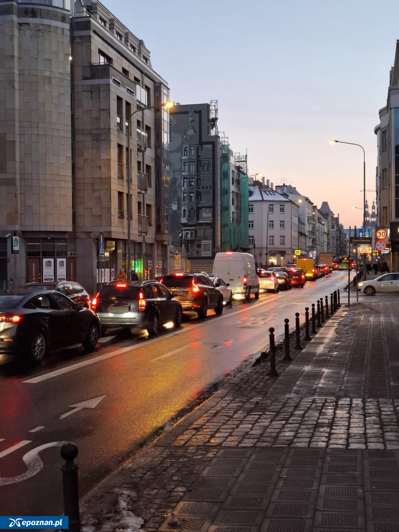 Kierowcy stoją w dużych korkach na ulicach w centrum Poznania