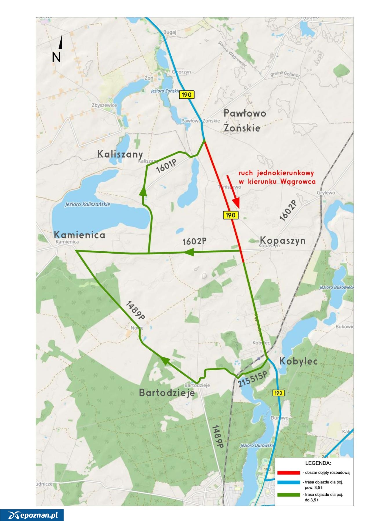 "Od tego dnia przywrócony zostanie ruch dwukierunkowy na całej trasie, z wyjątkiem odcinka od Pawłowa Żońskiego (skrzyżowanie z DP 1601P) do Kopaszyna (skrzyżowanie z DG 215513P), gdzie nadal obowiązywać będzie ruch jednokierunkowy. Objazd dla pojazdów powyżej 3,5 t pozostaje bez zmian. Poprowadzony jest drogami wojewódzkimi: 193, 241 i 242 (przez miejscowości Wągrowiec - Gołańcz - Margonin)"- dodano.