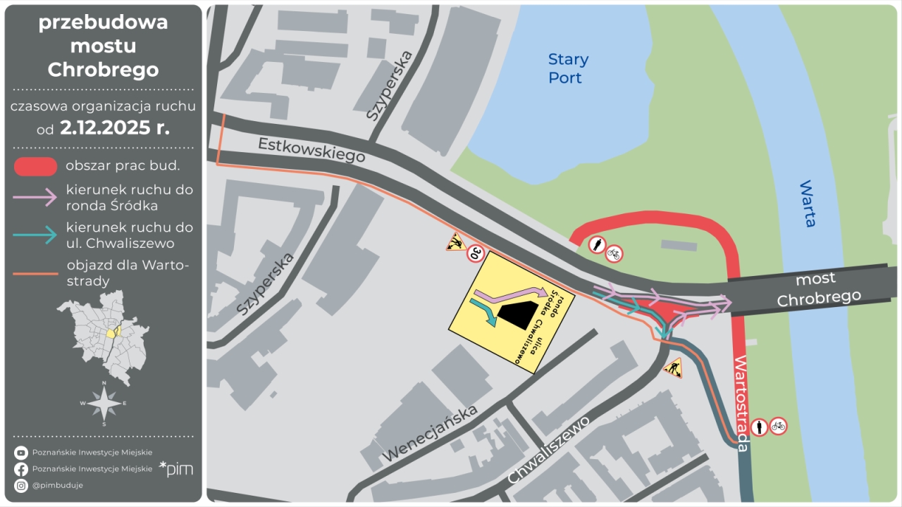 Wykonawca przebudowy mostu Bolesława Chrobrego kontynuuje prace związane z infrastrukturą podziemną. Z tego powodu konieczne są zmiany w organizacji ruchu po zachodniej stronie mostu - na skrzyżowaniu ulic Estkowskiego i Chwaliszewo. Zostaną one wprowadzone 2 grudnia, po porannym szczycie komunikacyjnym.