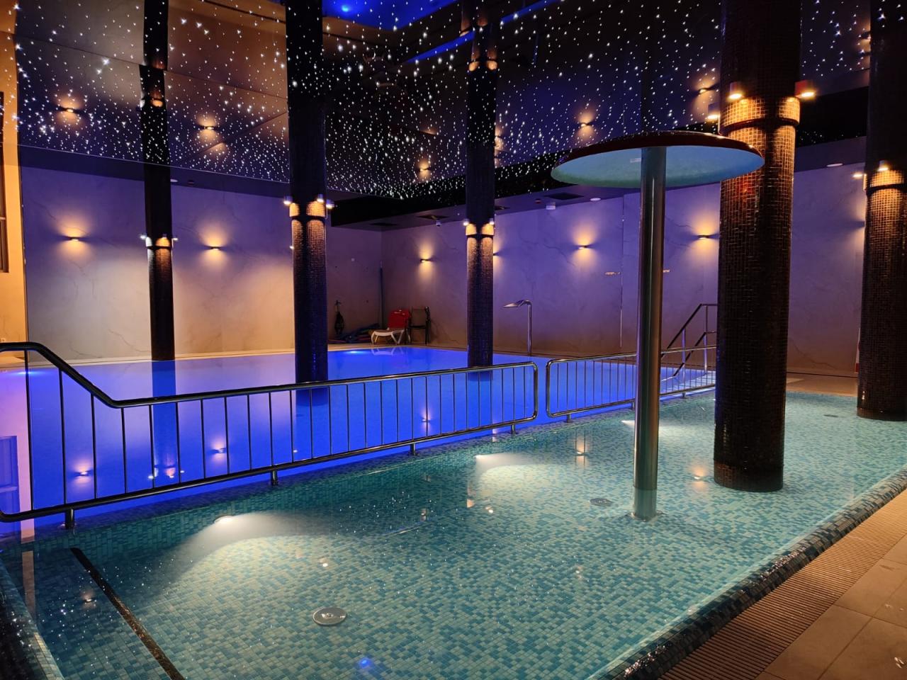 - Basen z ciepłą wodą: Idealny do zabawy dla dzieci i relaksu dla dorosłych.