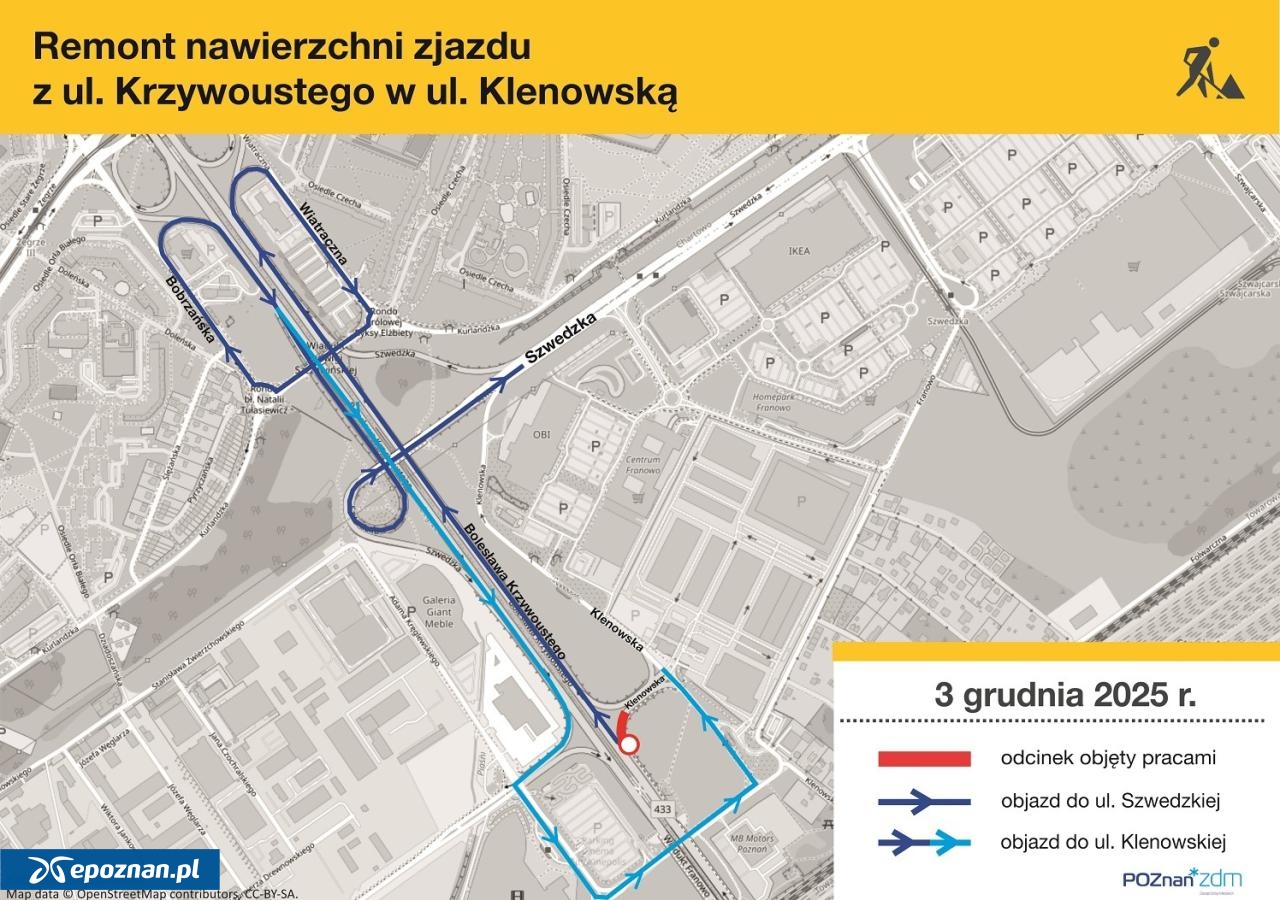 Osoby udające się od strony A2 w kierunku Franowa będą musiały korzystać z objazdów - ulicami Krzywoustego, Wiatraczną, wiaduktem Jadwigi Szczawnickiej, Bobrzańską oraz Krzywoustego w Klenowską. Prace planowane są na jeden dzień.