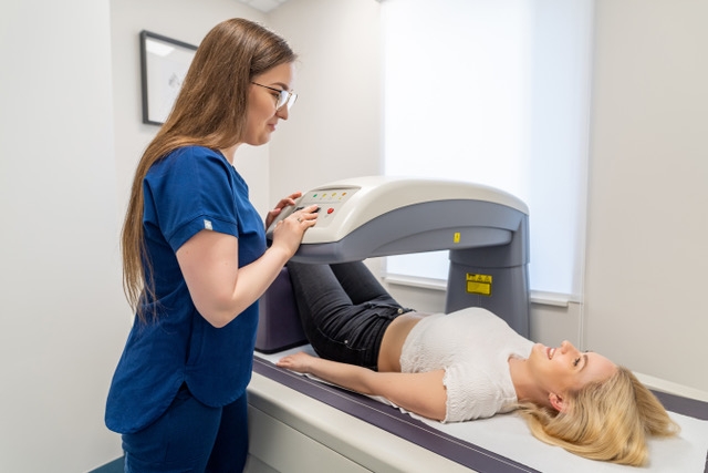 - densytometria - badania gęstości kości wykonywane są z szyjki kości udowej i/lub kręgosłupa. W pracowni możliwe jest także wykonanie badania składu ciała - total body;
