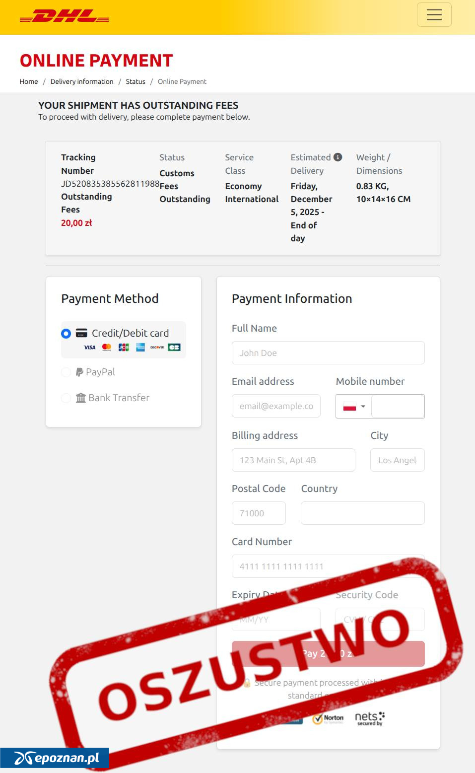"Obserwujemy kolejną kampanię phishingową, w której oszuści podszywają się pod firmę kurierską. Tym razem pod DHL, ale warto pamiętać, że zmiana logotypu czy nazwy to dla przestępców kwestia kilku chwil - podobne ataki mogą wykorzystywać logo dowolnej firmy. W wiadomościach e-mail przestępcy informują o rzekomej konieczności przejścia przez odprawę celną i uiszczenia niewielkiej opłaty, aby przesyłka mogła zostać dostarczona"- przekazano.
