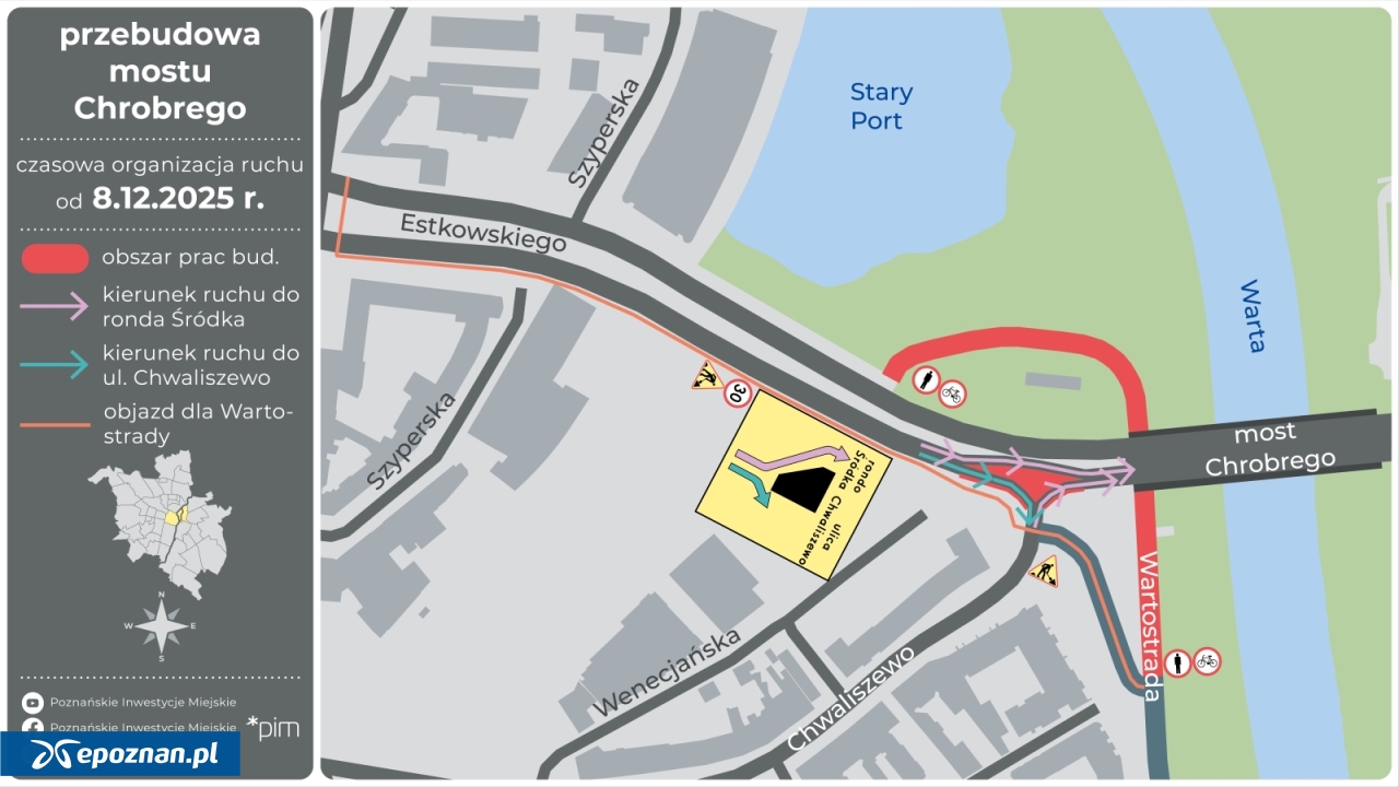 "Zmiana planowana na 8 grudnia dotyczyć będzie jezdni ul. Estkowskiego prowadzącej w stronę ronda Śródka. Na wysokości ul. Chwaliszewo przejazd możliwy będzie jednym pasem, który wyznaczony zostanie na torowisku tramwajowym z wykorzystaniem przygotowanej wcześniej przewiązki. Na tym etapie zachowany zostanie wjazd z ul. Estkowskiego w ul. Chwaliszewo, a także wyjazd z ul. Chwaliszewo w kierunku Śródki. Prędkość zostanie ograniczona do 30 km/h. Prosimy o zachowanie ostrożności i zwracanie uwagi na bieżące oznakowanie"- informują przedstawiciele PIM.