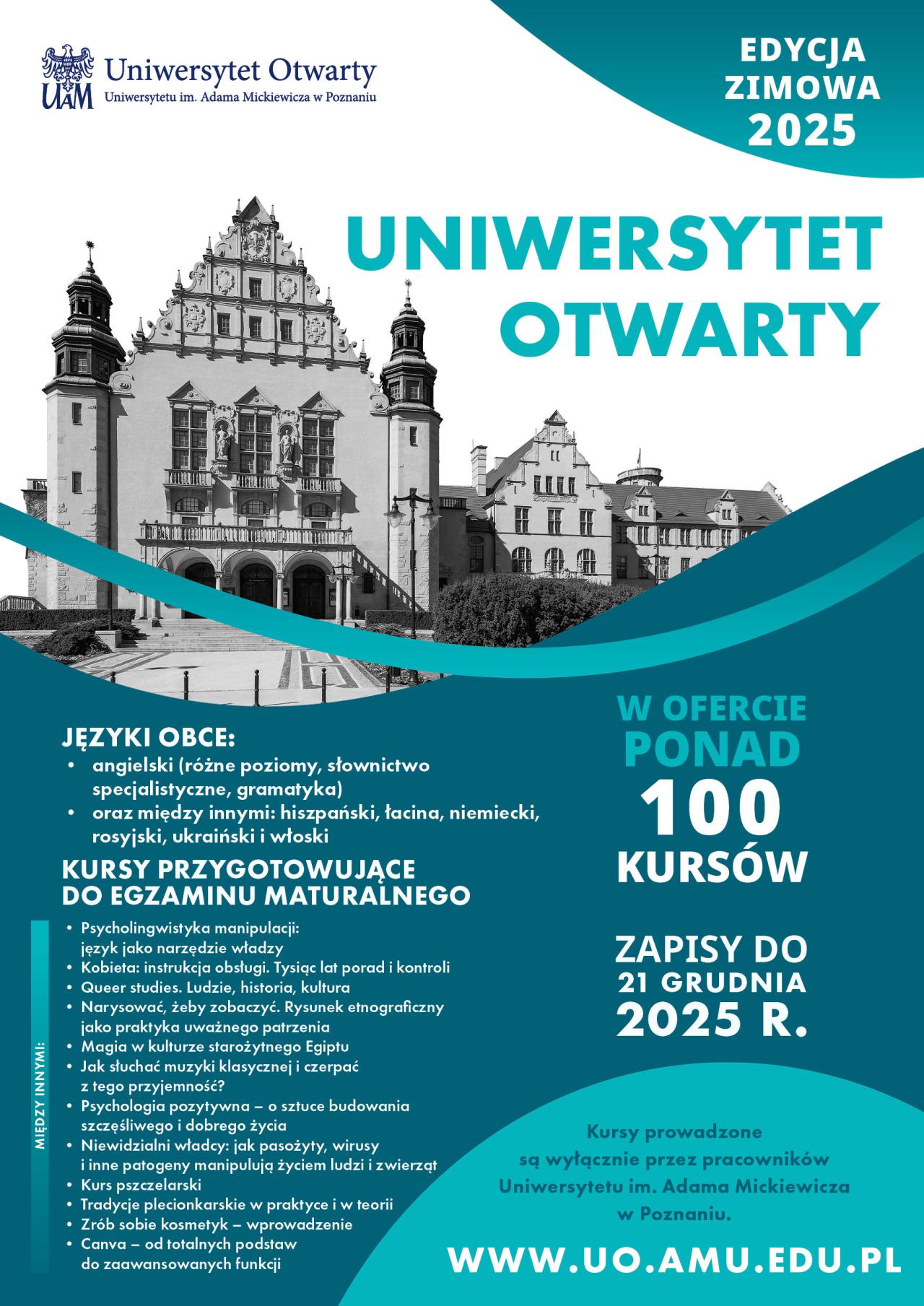 Opublikowana na początku grudnia lista kursów potwierdza, że uczelnia stawia na różnorodność. W ofercie UO UAM znalazło się łącznie ponad 100 pozycji. Przeglądając tematykę zajęć, trudno oprzeć się wrażeniu, że program został skrojony tak, by odpowiedzieć na każdą, nawet najbardziej niszową potrzebę poznawczą mieszkańców regionu.
