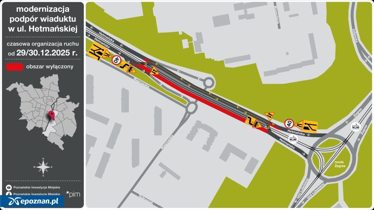 - Dla kierowców zmiana oznacza, że wyłączona z ruchu zostanie jezdnia południowa ul. Hetmańskiej, a przejazd po jednym pasie w obu kierunkach będzie możliwy północną częścią, tj. od strony os. Armii Krajowej. Poruszający się ul. Hetmańską w stronę ronda Żegrze przemieszczą się na drugą jezdnię przewiązkami, czyli tymczasowymi przejazdami przez torowisko tramwajowe znajdującymi się po obu stronach wiaduktu. W dalszym ciągu należy zachować szczególną ostrożność przy pokonywaniu torowiska i bezwzględnie ustępować tramwajom. Ze względów bezpieczeństwa w rejonie prac nadal będzie obowiązywało ograniczenie prędkości do 40 km na godzinę - dodają.