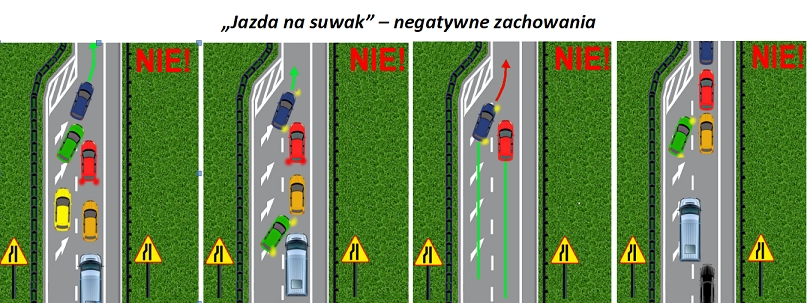 Jak wyjaśnia, w miejscu, w którym jeden z pasów ruchu ulega zwężeniu, kierowcy poruszający się pasem kończącym się, powinni dojechać nim do samego zwężenia, a następnie - z zachowaniem szczególnej ostrożności - włączyć się do ruchu. Z kolei kierujący jadący pasem sąsiednim mają obowiązek umożliwić wjazd jednemu pojazdowi z pasa zanikającego. Wjazd powinien odbywać się naprzemiennie, czyli zgodnie z zasadą jazdy "na suwak" - jeden pojazd z jednego pasa, następnie jeden z drugiego.