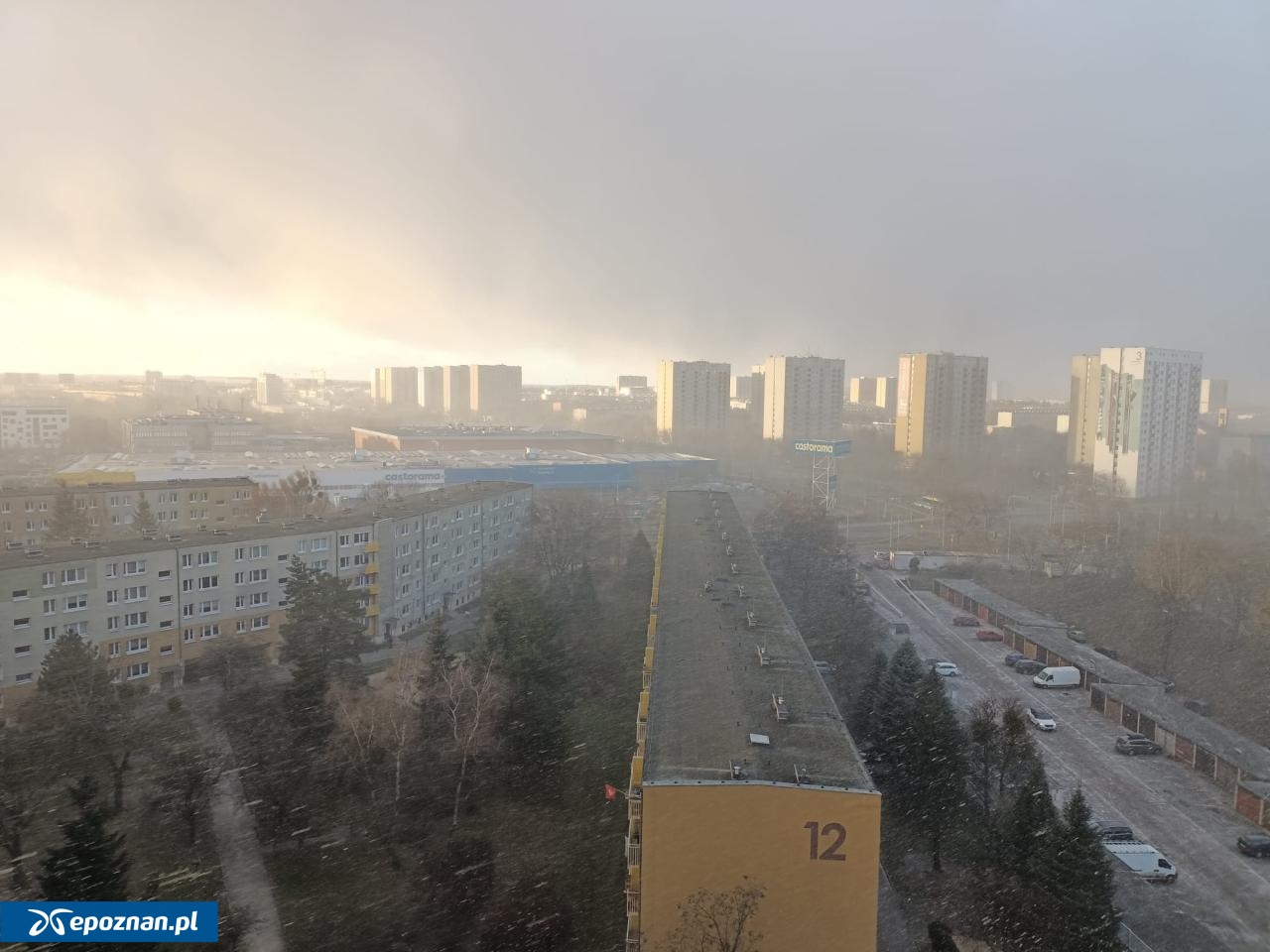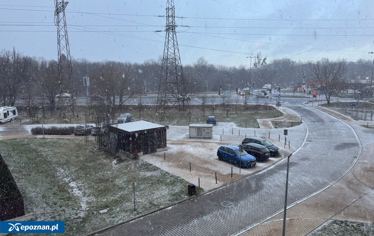 Słońce i śnieg - tak po 14.00 wygląda sytuacja w Poznaniu. Nagłe, intensywne opady nie potrwają długo, ale mogą spowodować spore komplikacje na drogach i chodnikach. Temperatura aktualnie utrzymuje się nieznacznie powyżej zera, ale już około 16.00 spadnie do zera, by następnie w nocy spaść do -4 stopni. Taki mokry śnieg może więc zamienić się w lodowisko.