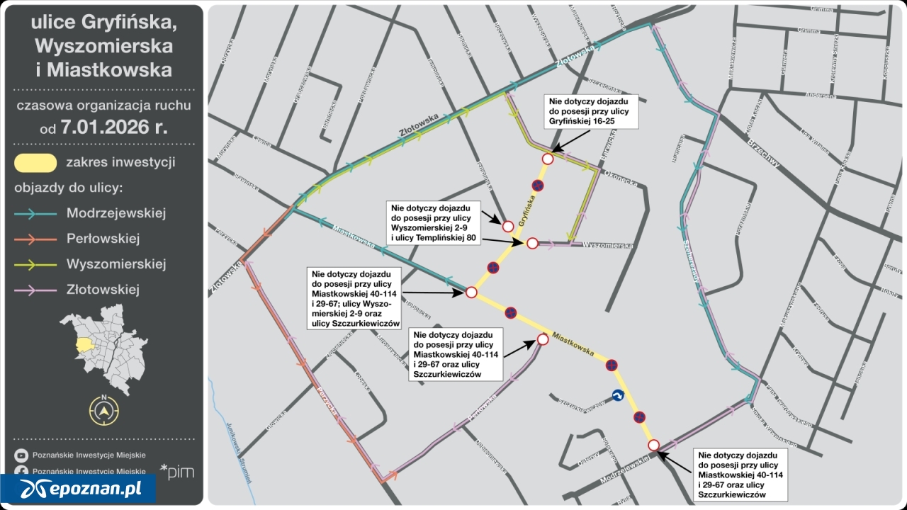 "Od 7 stycznia będzie zamknięta ul. Wyszomierska między Miastkowską a ul. Gryfińską i Templińską wraz ze skrzyżowaniem tych ulic. W tym samym czasie wyłączona z ruchu zostanie ul. Gryfińska od wskazanego skrzyżowania do ul. Okoneckiej. Objazdy poprowadzone zostaną ulicami: Modrzejewskiej, Makuszyńskiego, Szeherezady, Brzechwy, Złotowską, Barwicką, Perzycką i Perłowską. Dostęp do posesji zostanie zachowany"- informują przedstawiciele PIM.