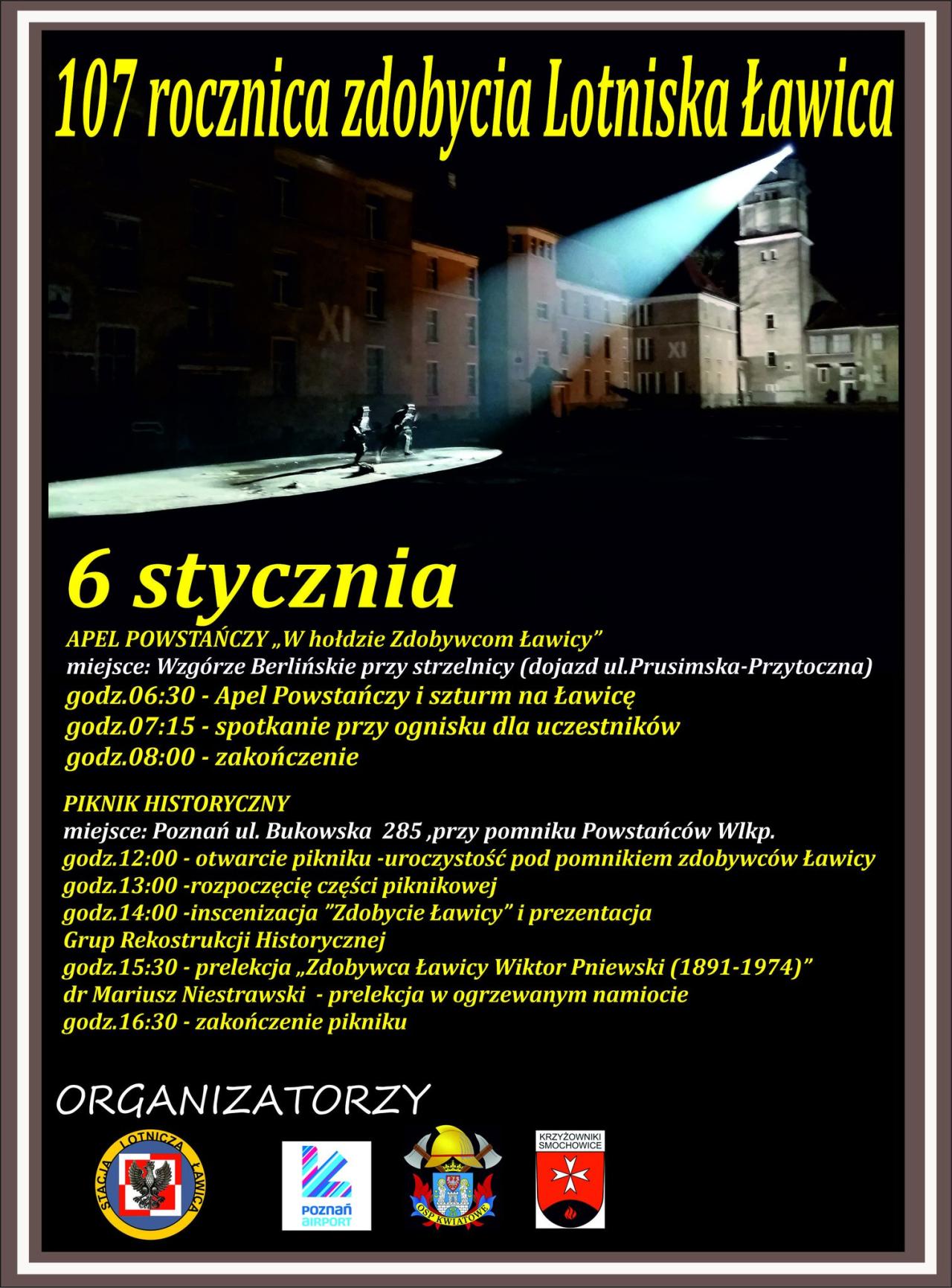 O godzinie 13:00 w okolicy pomnika Zdobywców Ławicy rozpocznie się piknik historyczny. W programie wydarzenia zaplanowano prezentację grup rekonstrukcyjnych wraz z ich wyposażeniem. Odbędzie się także druga edycja konkursu jazdy konnej o "Nagrodę Zdobywców Ławicy". Jednym z głównych punktów będzie rekonstrukcja walk o Ławicę, uzupełniona pokazem historycznego sprzętu militarnego i pojazdów. Uczestnicy zobaczą również defiladę kawalerii 15. Pułku Ułanów Poznańskich. Na terenie wydarzenia dostępne będą stoiska kolekcjonerskie, pamiątkowe oraz cateringowe, a dla zainteresowanych historią przygotowano prelekcję w specjalnie zaaranżowanym namiocie. Piknik potrwa do godziny 16:30.