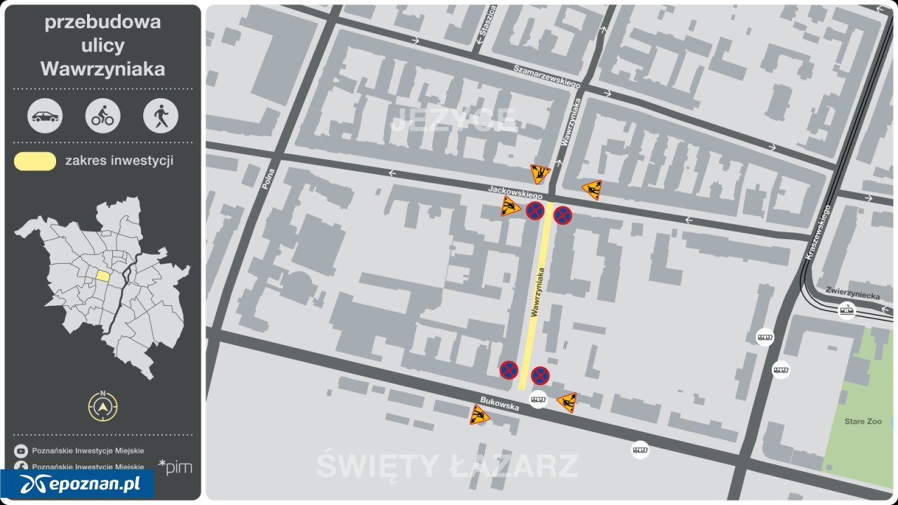 Jak już informowaliśmy w ubiegłym tygodniu rozpoczęły się prace na Jeżycach. Ulica zyska więcej zieleni, wygodniejsze chodniki oraz nową jezdnię na odcinku między Jackowskiego a Bukowską. W ramach inwestycji jezdnia ul. Wawrzyniaka zostanie wyłożona kamienną kostką, a chodniki nawiążą wyglądem do tych na przebudowanej ul. Jackowskiego. Zaplanowano też miejsca postojowe równolegle do jezdni. Od strony ul. Bukowskiej powstanie skwer z nową zielenią, oddzielający ulicę od ruchu samochodowego. Przewidziano przejazd rowerowy oraz elementy małej architektury, m.in. ławki i stojaki na rowery.