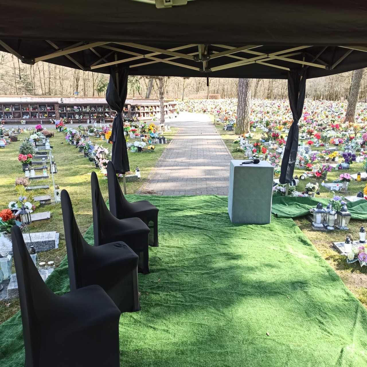 - eleganckie namioty żałobne, chroniące przed słońcem i deszczem,