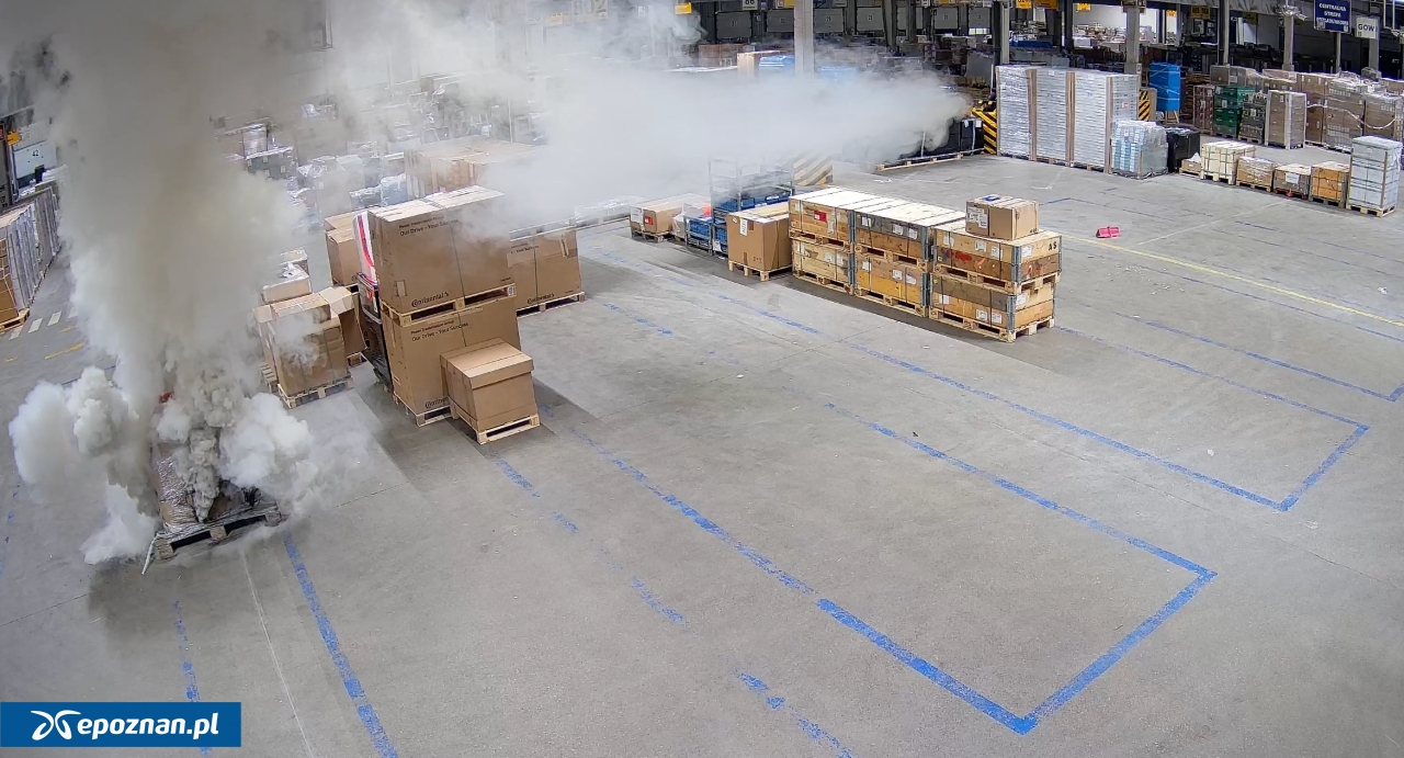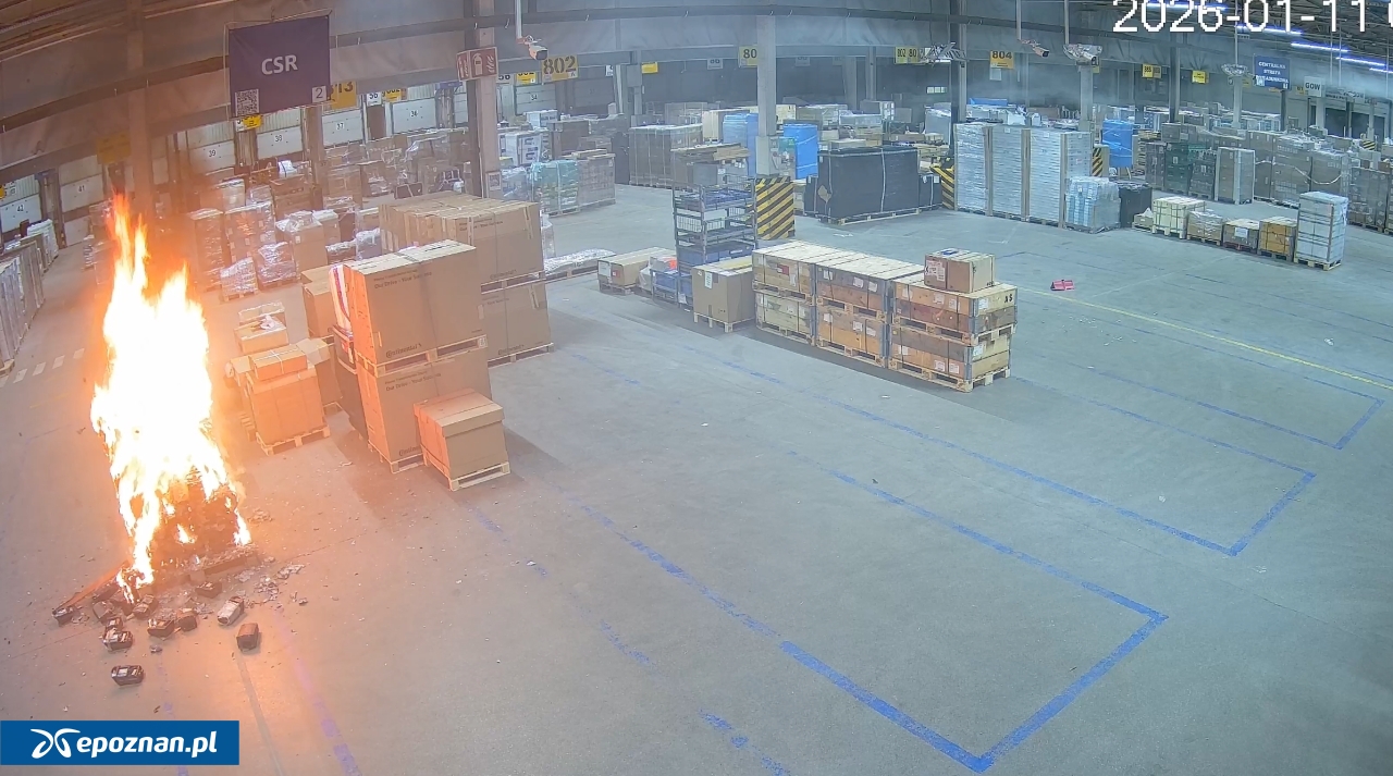 Najpierw duże zadymienie, a po sekundach - płomienie. Tak wyglądał początek pożaru hali magazynowej w Tarnowie Podgórnym. Na nagraniu z monitoringu udostępnionym przez poznańską prokuraturę widać, że przy ładunku, w którym zgodnie z ustaleniami prokuratury były baterie do hulajnóg, nikt się nie pojawił przed wybuchem ognia. Oznacza to, że do pożaru nie przyczyniły się osoby trzecie, na przykład znajdujące się w tym czasie w magazynie. W pierwszej fazie pożaru do paczki dobiega natomiast mężczyzna z gaśnicą i próbuje opanować pożar, jednak ogień nie słabnie, dlatego po pewnym czasie odkłada gaśnicę i ucieka - widać to na nagraniu: