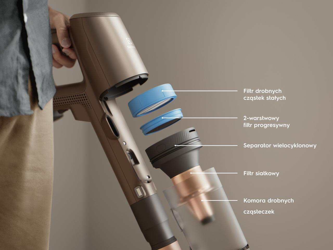 Separator cyklonowy, filtry progresywne, filtr siatkowy oraz komora drobnych cząsteczek współpracują ze sobą, tworząc skuteczną barierę dla zanieczyszczeń i zapobiegając ich ponownemu przedostawaniu się do otoczenia. Całość przekłada się na doskonałą czystość podłóg i zdrowsze, świeższe powietrze w całym domu.