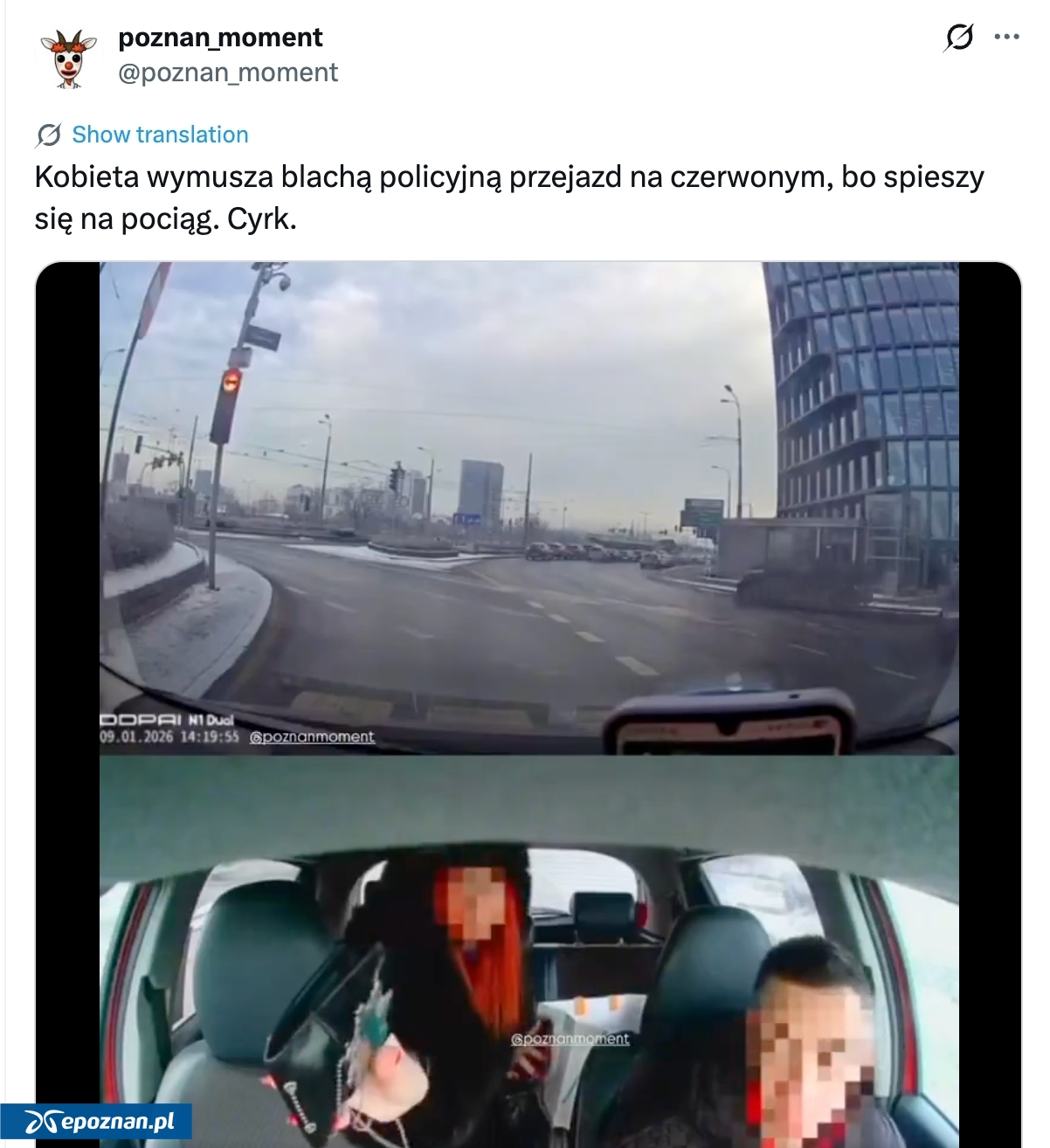 Upublicznił je profil poznanmoment na Instagramie z adnotacją: "Kobieta wymusza blachą policyjną przejazd na czerwonym, bo spieszy się na pociąg. Cyrk". Na nagraniu widać sytuację z rejonu ronda Kaponiera. Na tylnej kanapie pojazdu siedzi kobieta, a za kierownicą mężczyzna wykonujący transport osób. Mężczyzna zatrzymuje się na czerwonym świetle i jest namawiany przez pasażerkę, by przejechał, ponieważ ona się spieszy. Po chwili kobieta wyciąga z torebki coś, co wygląda jak policyjna odznaka. Mężczyzna pozostaje nieugięty i wyjaśnia kobiecie, że w tym miejscu są kamery rejestrujące przejazd na czerwonym świetle. Pasażerka w końcu się poddaje, zauważając, że spieszy się na pociąg.