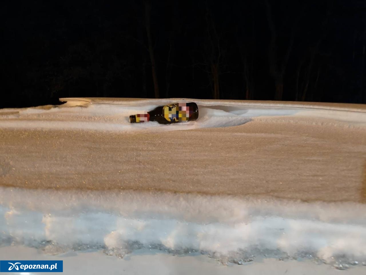 "Auto wyglądało jak na załączonych zdjęciach. Na dachu pojazdu, oprócz zalegającego śniegu, znajdowała się butelka z zawartością trunku" - przekazują funkcjonariusze.