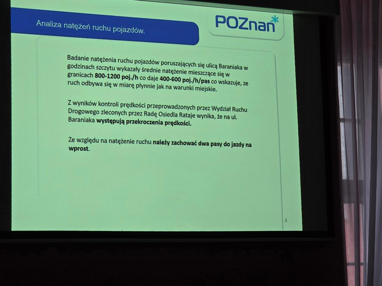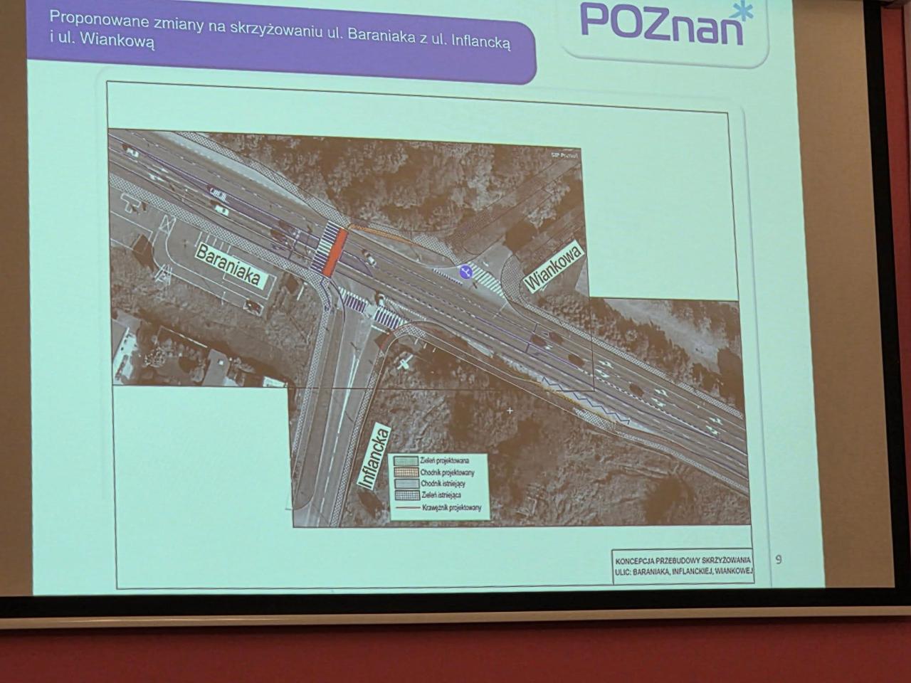 "Niestety, nasze wcześniejsze postulaty nie zostały na tym etapie uwzględnione. Przedstawiona przez MIR propozycja obejmuje m.in.: ujednolicenie prędkości do 50 km/h na całym odcinku ul. Baraniaka - projekt został już zatwierdzony i przekazany do ZDM, likwidację przejść dla pieszych bez sygnalizacji świetlnej, wyznaczenie nowego przejścia z sygnalizacją świetlną na skrzyżowaniu z ul. Wołkowyską, dążenie do zmian w skanalizowaniu skrzyżowań z ul. Inflancką i Wiankową (wydzielenie osobnego pasa do skrętu w lewo) oraz możliwość dostosowania sygnalizacji świetlnej (tzw. "pętla"), która ma faworyzować kierowców jadących zgodnie z przepisami"- informuje w mediach społecznościowych radny Skrzypczak.