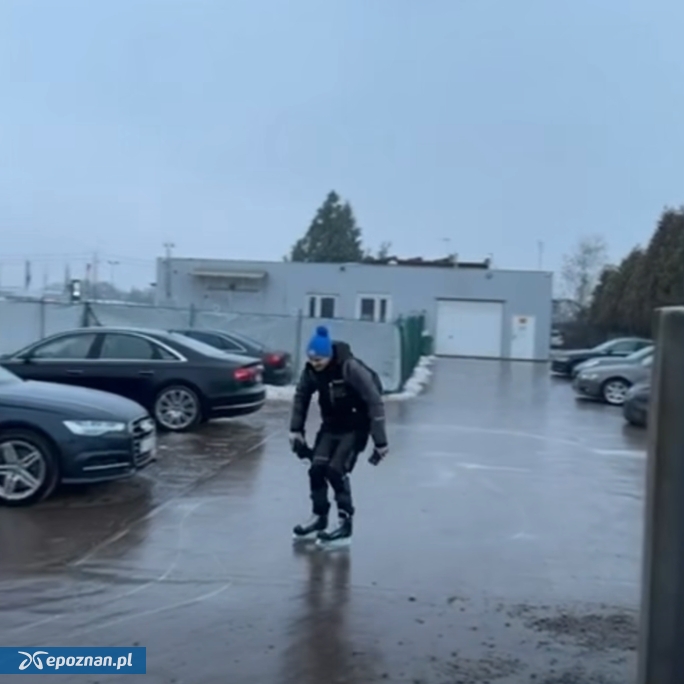 Od rana warunki na jezdniach i chodnikach są bardzo trudne - przypominają lodowisko. W Wysogotowie jeden z pracowników warsztatu samochodowego postanowił do pracy przyjechać na łyżwach: